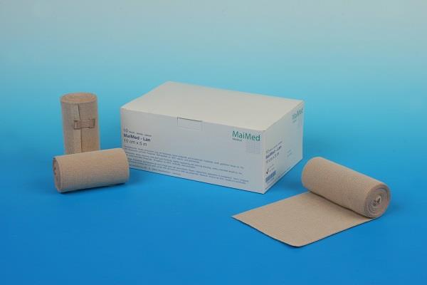 Kr äftig komprimierende, textilelastische Binde mit kurzem Zug. F ür eine starke